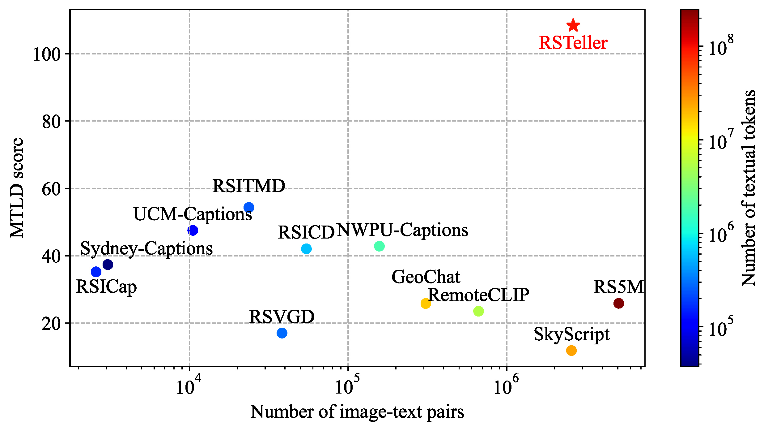 - RSTeller Dataset: 1.3M RS images with 2.6M high-quality captions (2x richer semantics than existing datasets)